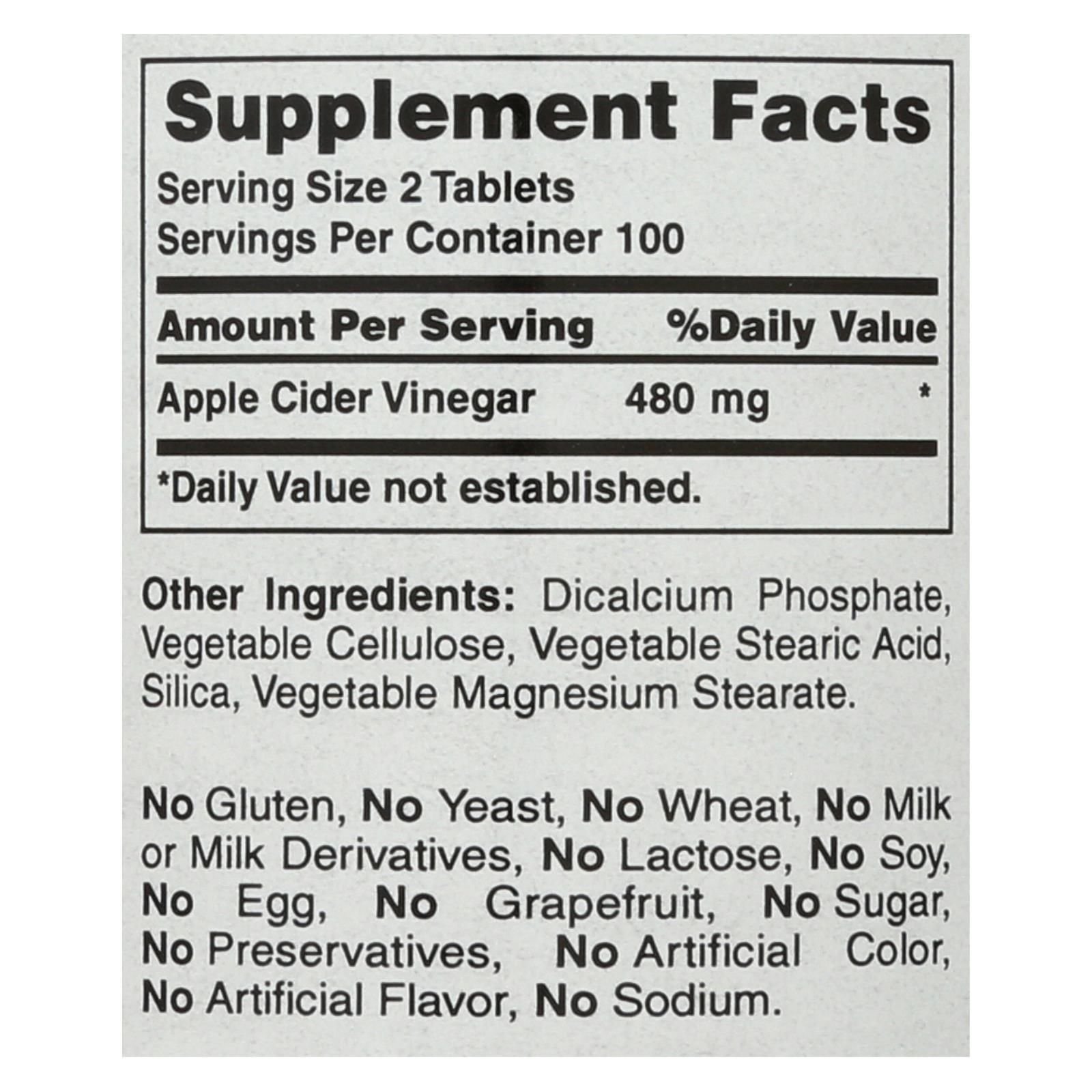American health apple cider vinegar tablets dietary supplement allows you to easily get all the health and digestion benefits of apple cider vinegar without enduring its sour taste. Our supplement is free from common allergens and potentially harmful ingredients, including soy, eggs, wheat, artificial colors and preservatives. Each bottle contains 200 vegetarian tablets.