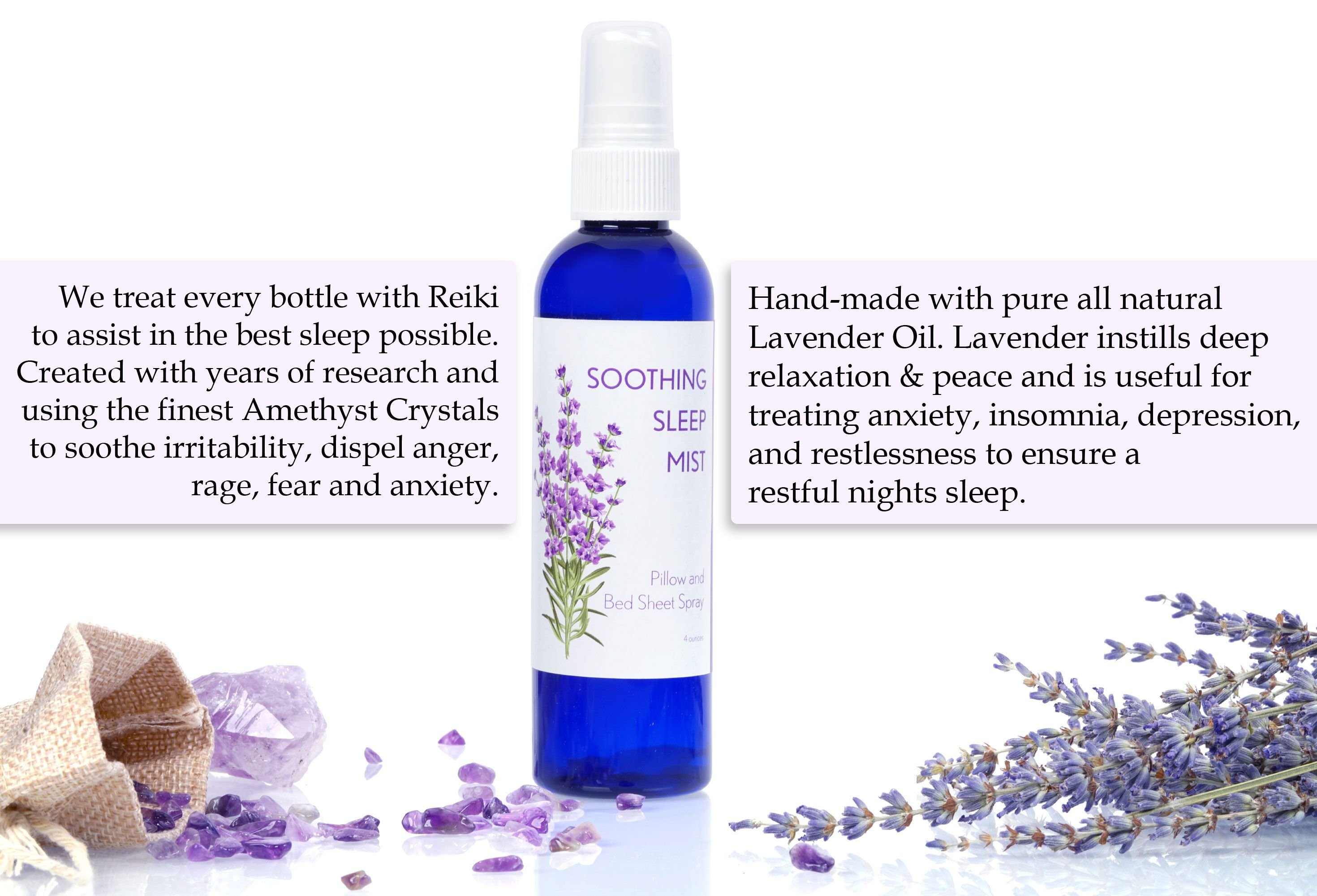 8 ounce spray mister. Designed for better sleep; our Soothing Sleep Mist is hand-crafted in the United States with 100% pure ORGANIC essential oils of Lavender and COMPLIMENTING ESSENTIAL OILS; Amethyst Crystals and Reiki charged. Carefully formulated to ensure you get the best sleep possible. These oils and Amethyst crystals are well known for their calming effect; ability to promote restful sleep and alleviating anxiety and stress. See how sleep can be effortless and easy once again with our Soothing Sleep Mist! PLEASE NOTE WE ONLY USE ORGANIC ESSENTIAL OILS. WE ONLY USE PURE UNTREATED NATURAL SPRING WATER; NOT CITY CHLORINATED TAP WATER AS DO MOST OTHER COMPETITORS. (cap color may vary)