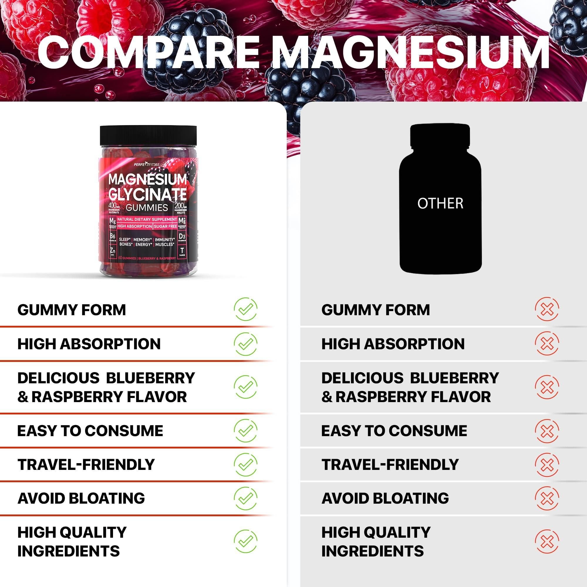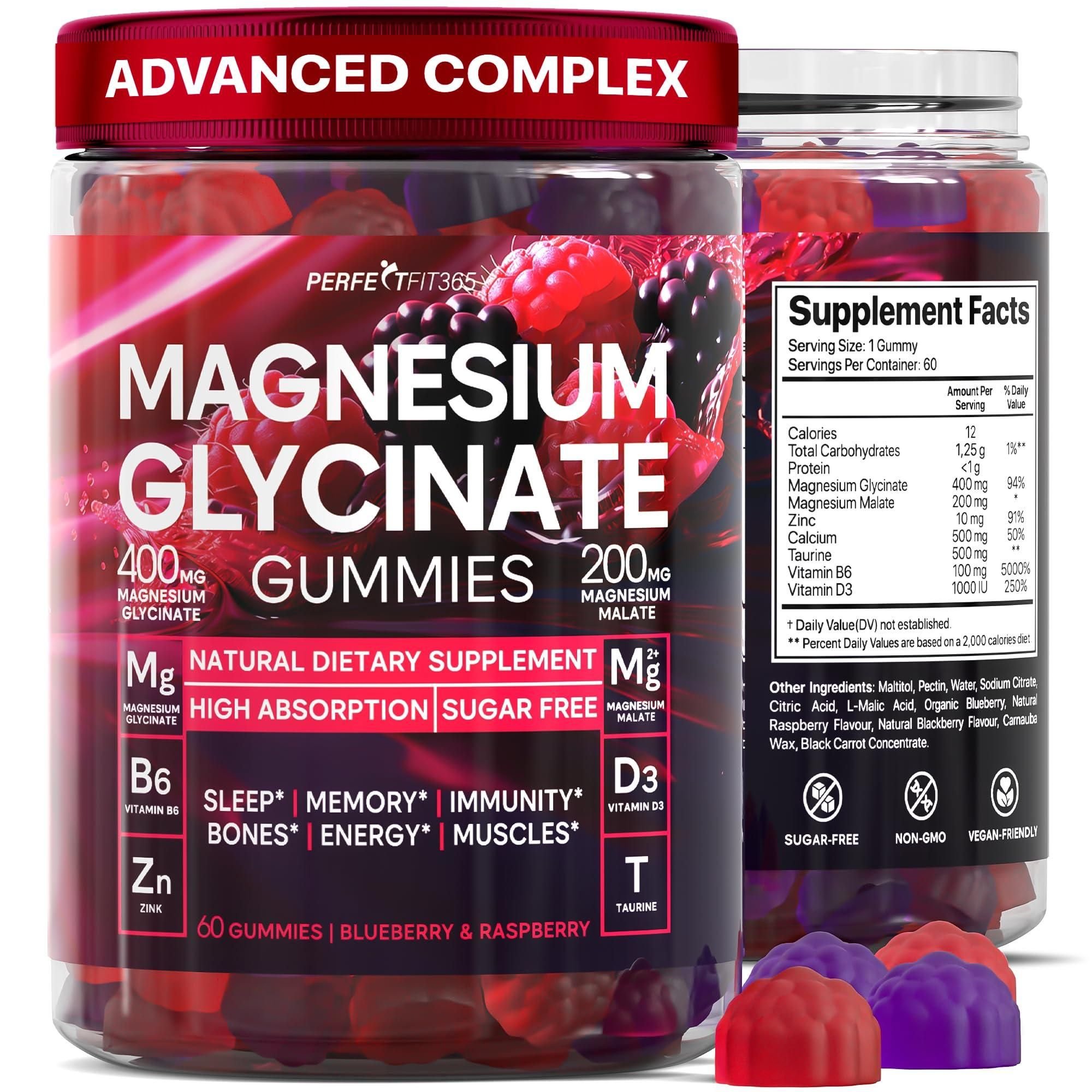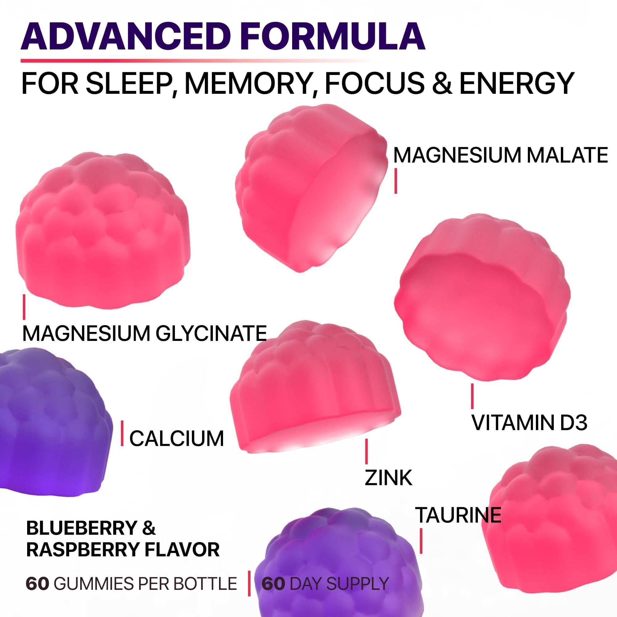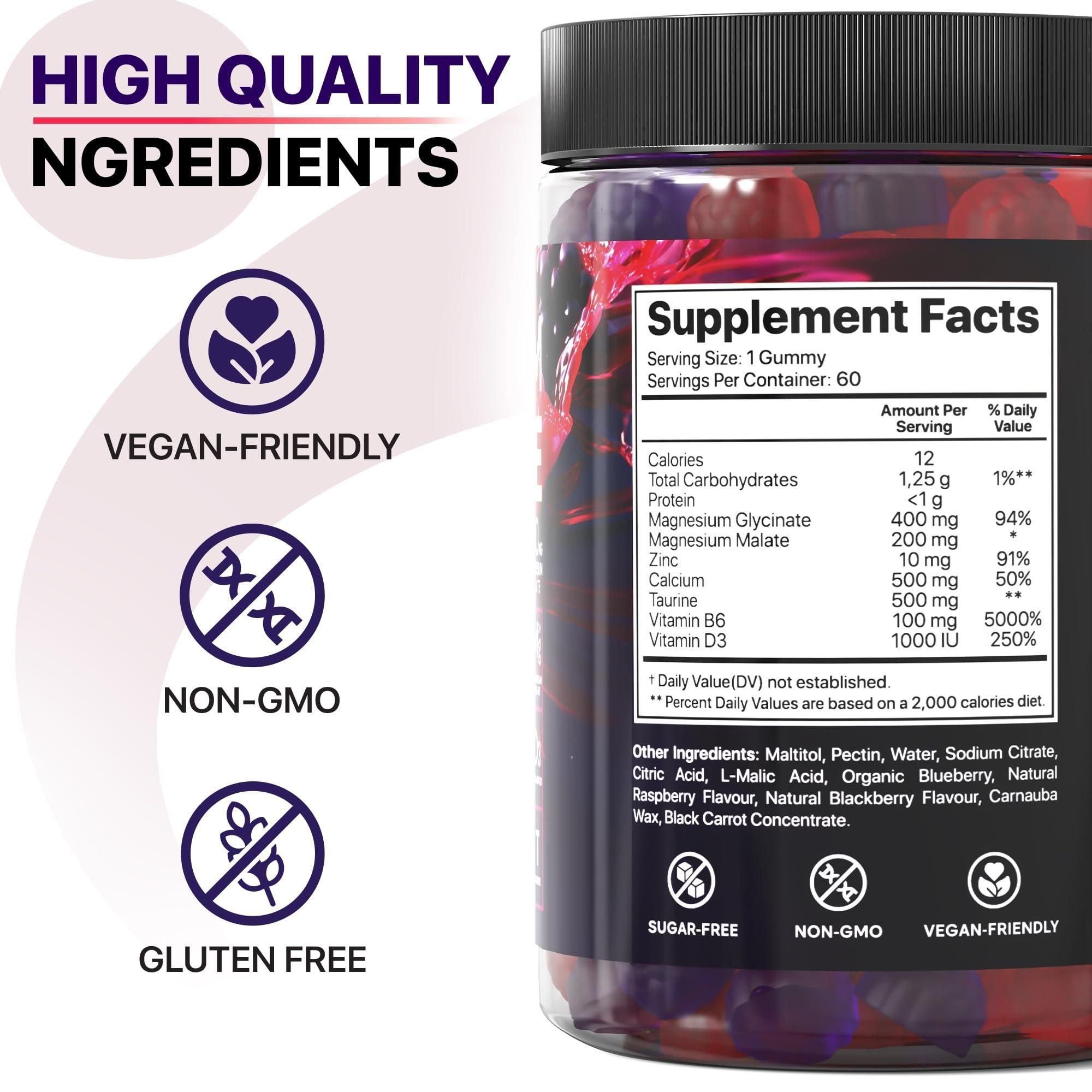 1.higher energy levels - we created these gummies magnesium with magnesium malate to help your body generate more energy and help you feel more awake. our magnesium glycinate malate gummies also contain taurine, which supports physical performance. comprehensive formula - we concocted our chewable magnesium glycinate with vitamin b6 and d3. combined, they can help the body produce more energy, make the bones healthier, and keep the mind more at ease. restful mind, happy you - at times