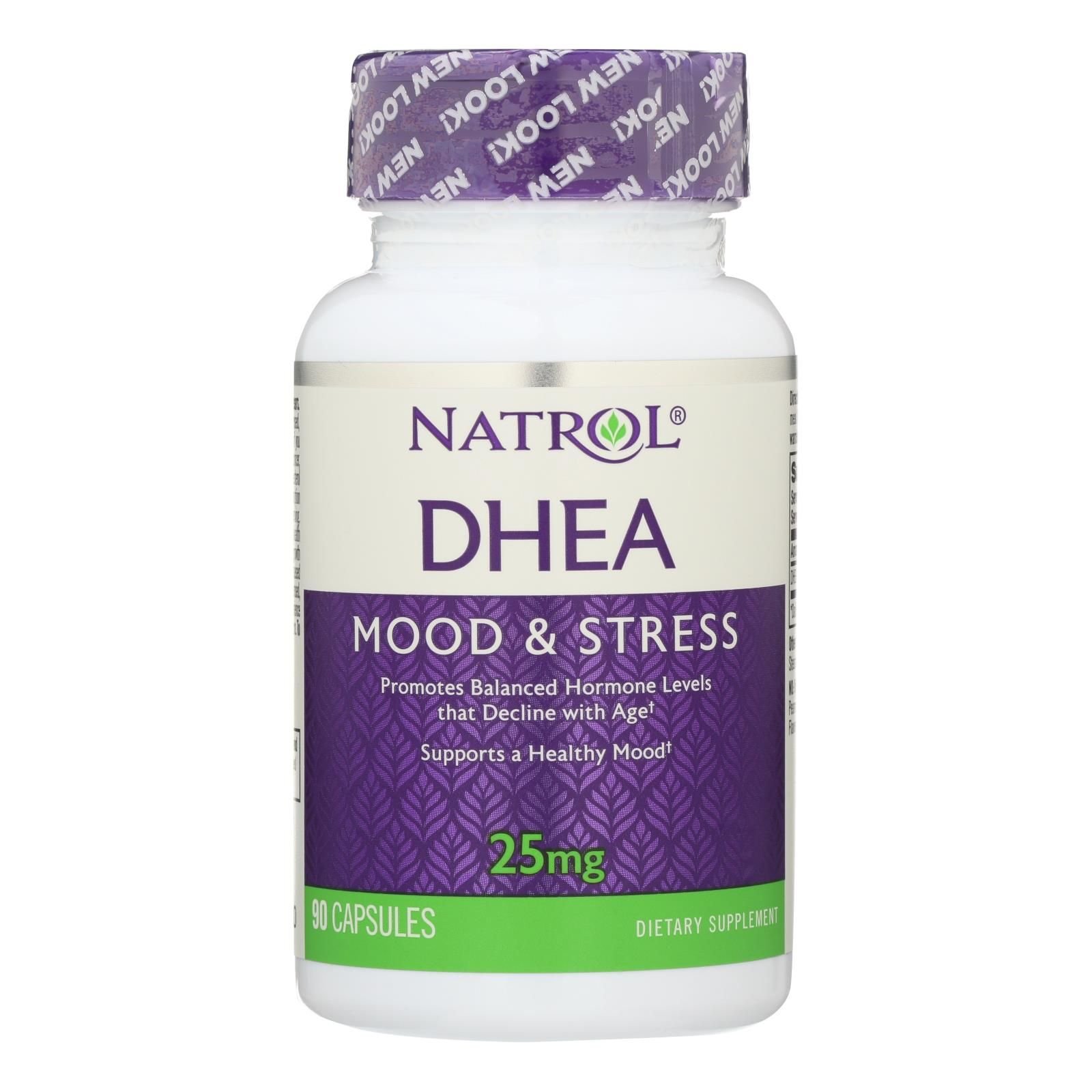 Natrol dhea mood & stress 25 mg. Dietary supplement may help your body balance hormone levels that decrease with age. Designed to help support a healthy mood, this dietary supplement boasts 25 mg. Of dhea formulated to support your overall health and wellness. For best results, take one capsule daily with food. Each bottle holds 90 capsules of dhea.