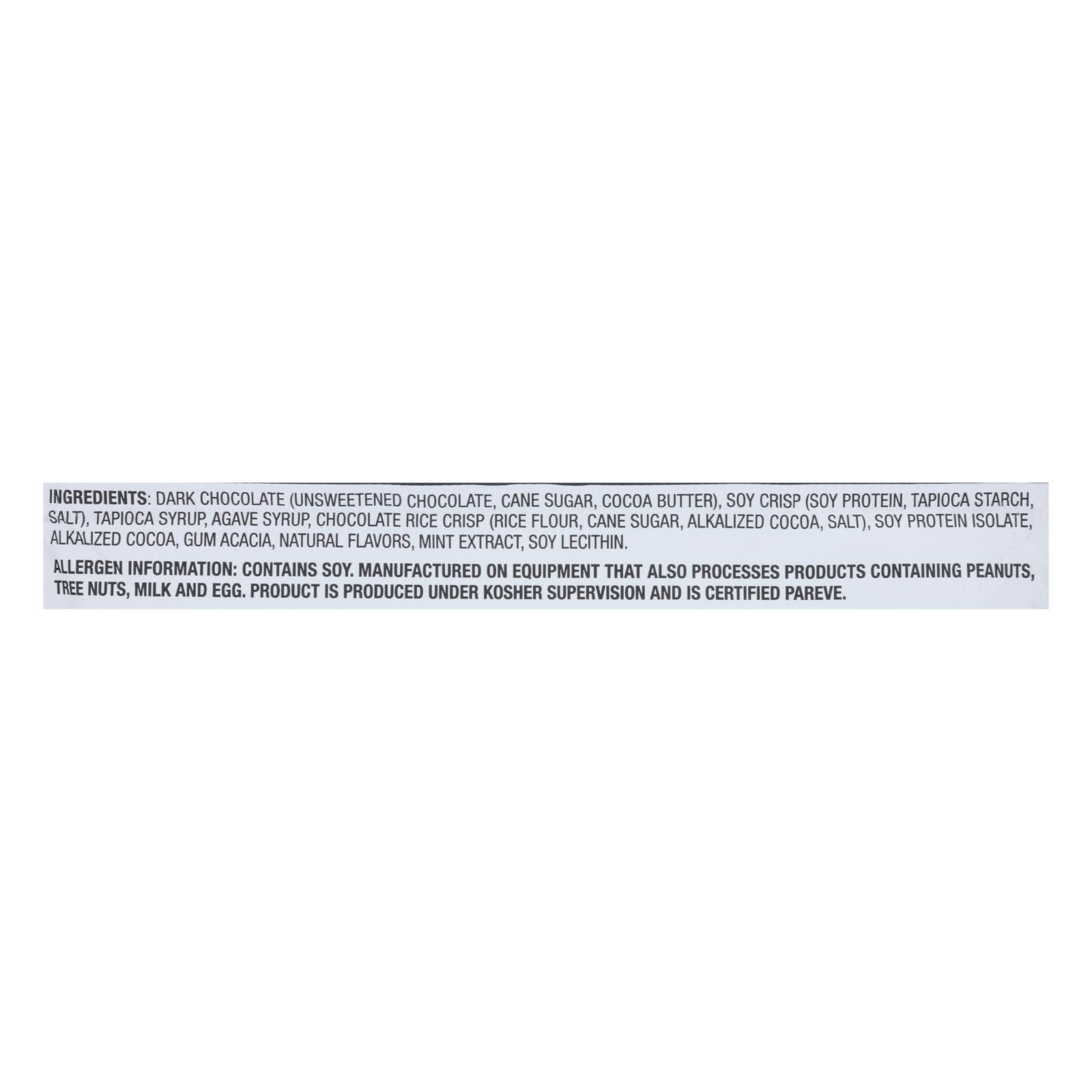 ingredients : dark chocolate (unsweetened chocolate, cane sugar, cocoa butter);soy crisp (soy protein, tapioca starch, salt);tapioca syrup;agave syrup;chocolate rice crisp (rice flour, cane sugar, alkalized cocoa, salt);soy protein;alkalized cocoa;gum acacia;natural flavors;mint extract;soy lecithin
