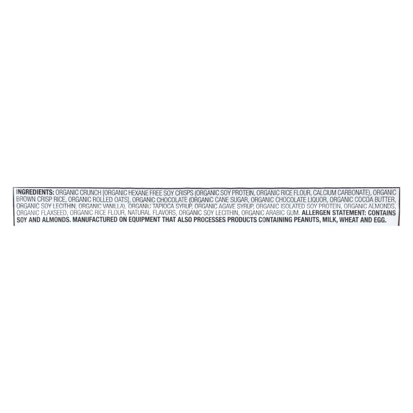 ingredients : organic crunch [organic hexane free soy crisps;organic soy protein;organic rice flour;calcium carbonate;organic brown crisp rice;organic rolled oats];organic chocolate;organic cane sugar;organic chocolate liquor;organic cocoa butter;organic soy lecithin;organic vanilla;organic tapioca syrup;organic agave syrup;organic isolated soy protein;organic almonds;organic flaxseed;natural flavors;organic arabic gum