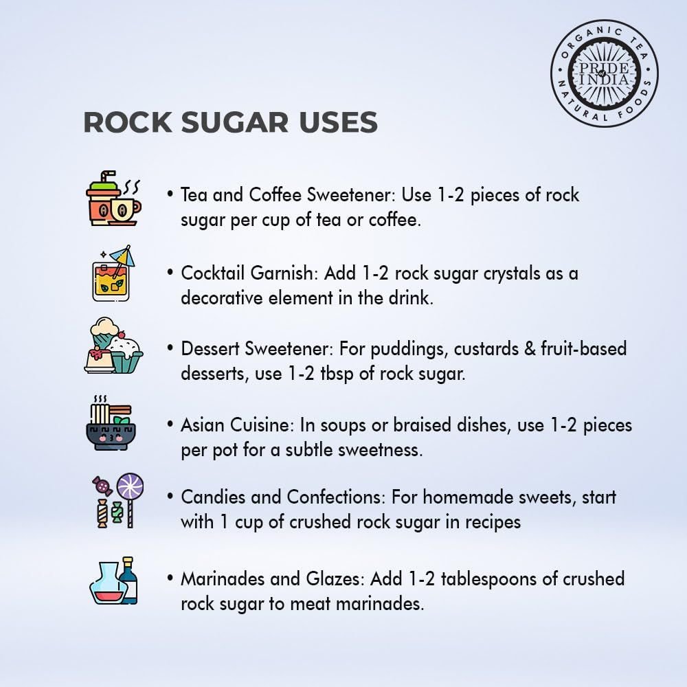 Pride Of India brings organically grown food and herbal products from India that enhance the overall health of the human body through the centuries long tradition of consuming pure foods from farm to table. We are a family owned company and source all our ingredients from direct farms in order to preserve the quality as well as freshness of all our products. We value sustainable farming and aim to build a company that benefits the entire food chain from the grass root level upwards. We are committed to sourcing the freshest organically grown spices from farms situated around the Indian subcontinent. Our organically cultivated pure spices render a wonderful cooking experience and ignite taste buds. Pride of India Organic Natural Crystal Rock Sugar Whole is also known as rock candy made up of sugar crystals. It is used for both culinary and health purposes. Rock Sugar is well known for sweetening tea or milk without changing its flavor and is also consumed as a candy. Dissolve it in warm water to make a sugar syrup and add it to iced tea, coffee, lemonades etc. There are multiple benefits of consuming natural rock sugar such as better digestion, soothes sore throat. We offer the product in small dual sifter jar which is easy to pour and store. It is best used with Pride of India various Organic Teas. Our customers are the most important link in fulfilling our aim and therefore, we strive to provide an unparalleled service in order to satisfy all our consumers to the best of our abilities. We hope that every customer has a great experience with us and enjoys our exclusive products to the utmost.