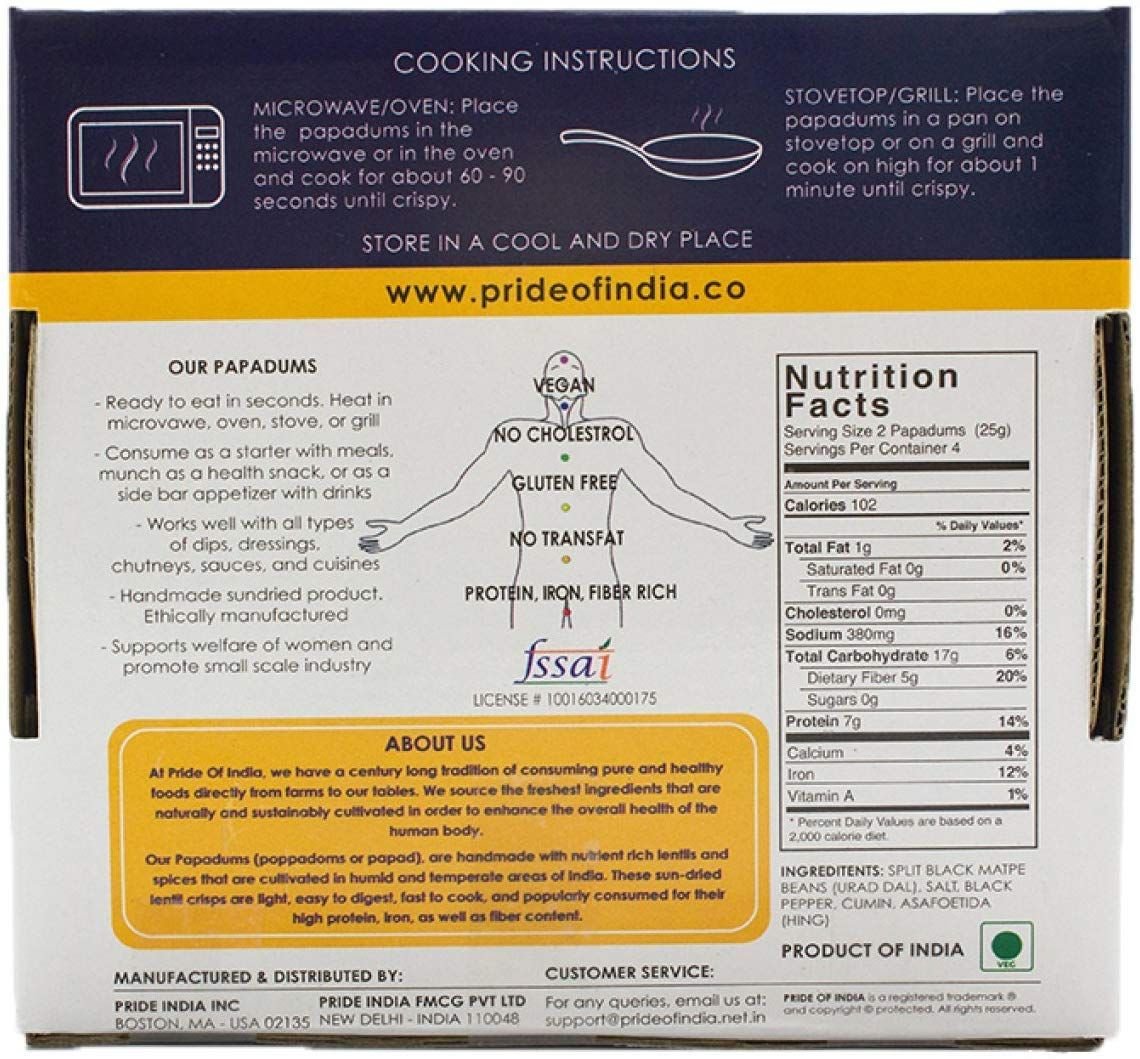 Pride of India incorporates organically-grown food and herbal products from India into our daily life. These all-natural ingredients help enhance the overall health of the human body. Pride of India is family owned and operated, and we manufacture our products in the USA. Indian papadums (poppadoms or papad) are a traditional Indian snack food. They are similar to tortillas and flatbreads. Our papadums are made of lentils and Indian spices. Lentils contain healthy protein, iron, and fiber. Plus, they help reduce cholesterol. Because these lentil crisps are gluten-free and don’t have trans fats, they are a healthier snack than traditional potato chips. These papadums are also handmade by women in India, and each purchase of these lentil crisps contributes to small businesses and women empowerment in India. Popadums are usually made as a dough that needs to rest before baking. These lentil crisps, however, are ready in seconds! Just put them over a heat source (oven, microwave, stove, etc.) for 60 to 90 seconds until crispy. Lentil crisps are a great meal starter or snack. With an intoxicating blend of Indian spices, you can eat them alone or dip them in sauces, curries, or hummus. This package contains 10 salty black bean namkeen papadums. Try other flavors of lentil crisps, and shop other health and beauty products by Pride of India.