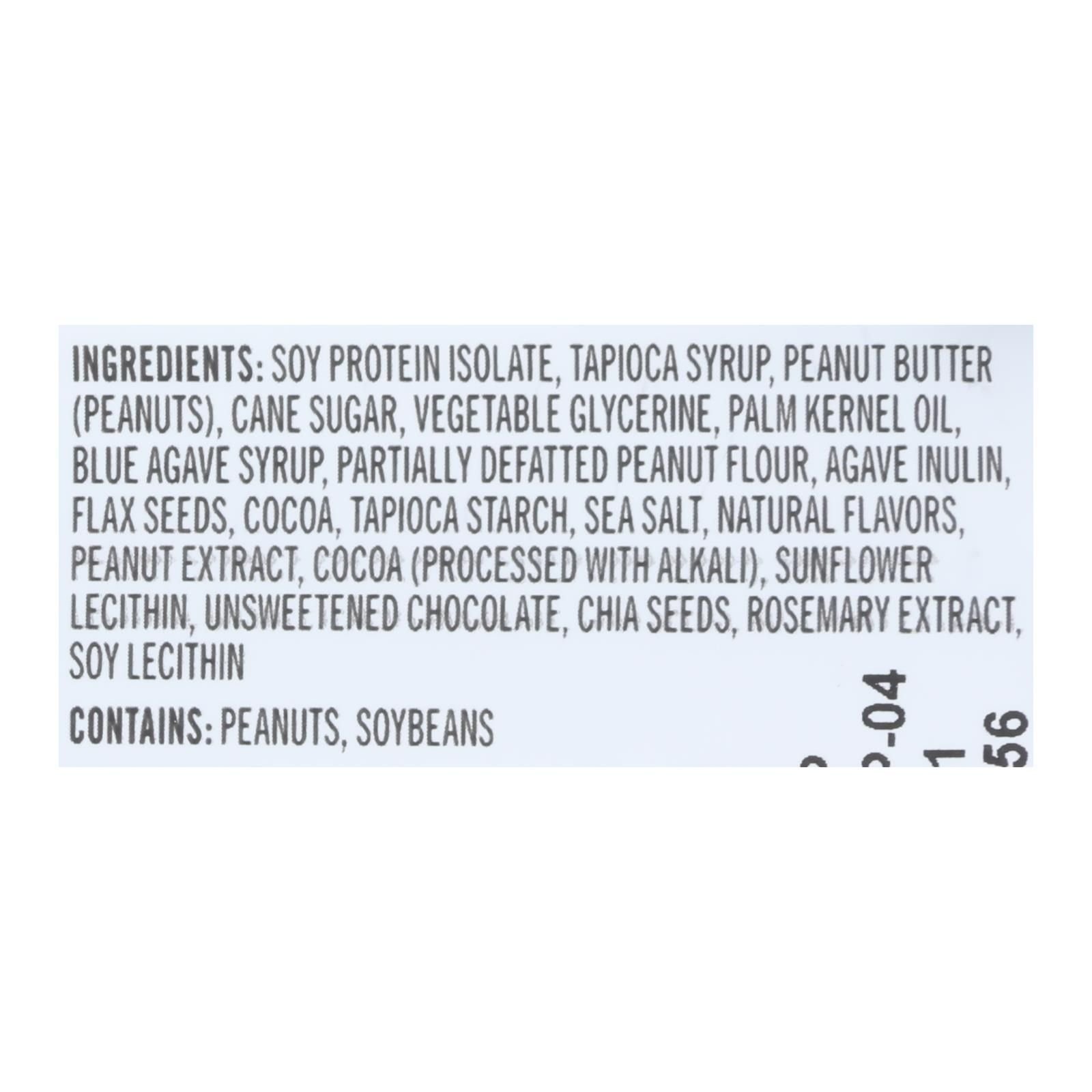 ingredients : soy protein isolate;tapioca syrup;peanut butter;peanuts;cane sugar;vegetable glycerine;palm kernel oil;blue agave syrup;partially defatted peanut flour;agave inulin;flax seeds;cocoa;tapioca starch;sea salt;natural flavors;peanut extract;processed with alkali;sunflower lecithin;unsweetened chocolate;chia seeds;rosemary extract;soy lecithin